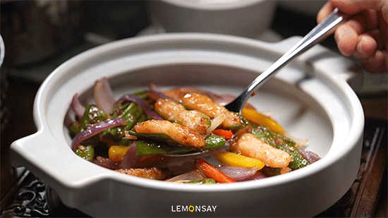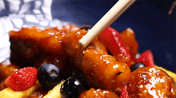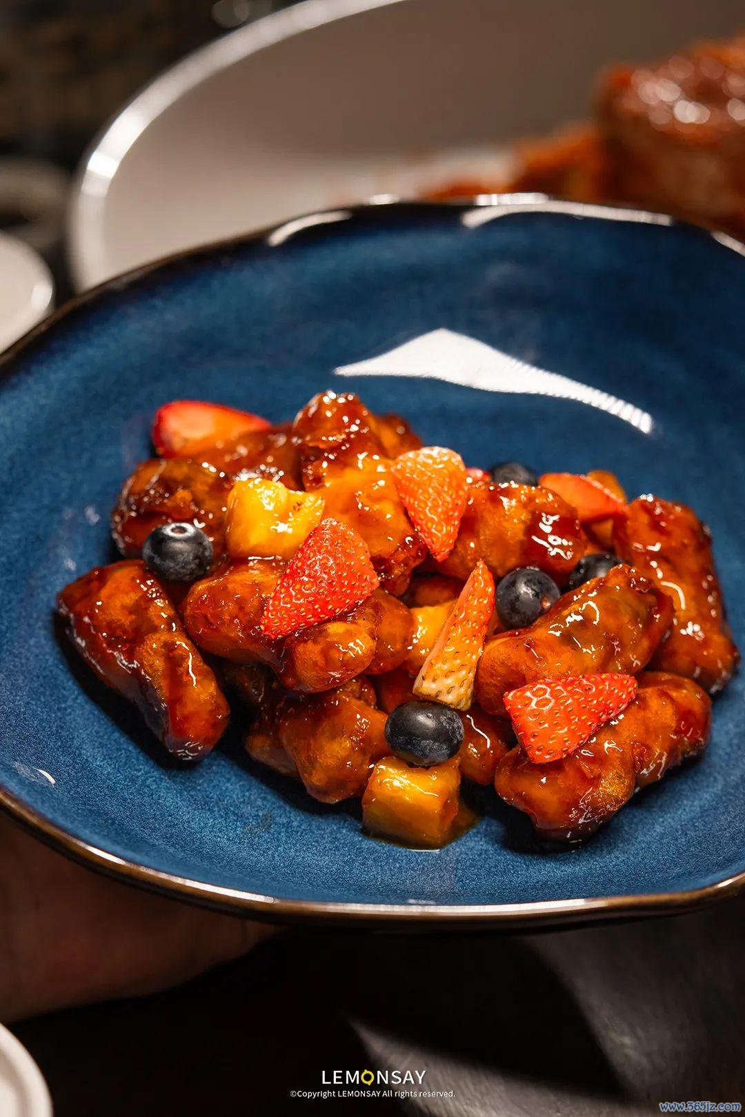 这谈证明陶陶居经典牌号冰镇咕噜肉为灵感,不息升级,现点现卷,手工将坚果酿入猪颈肉内,先炸再炒作念成咕噜肉,外酥里嫩进口满嘴坚果香。