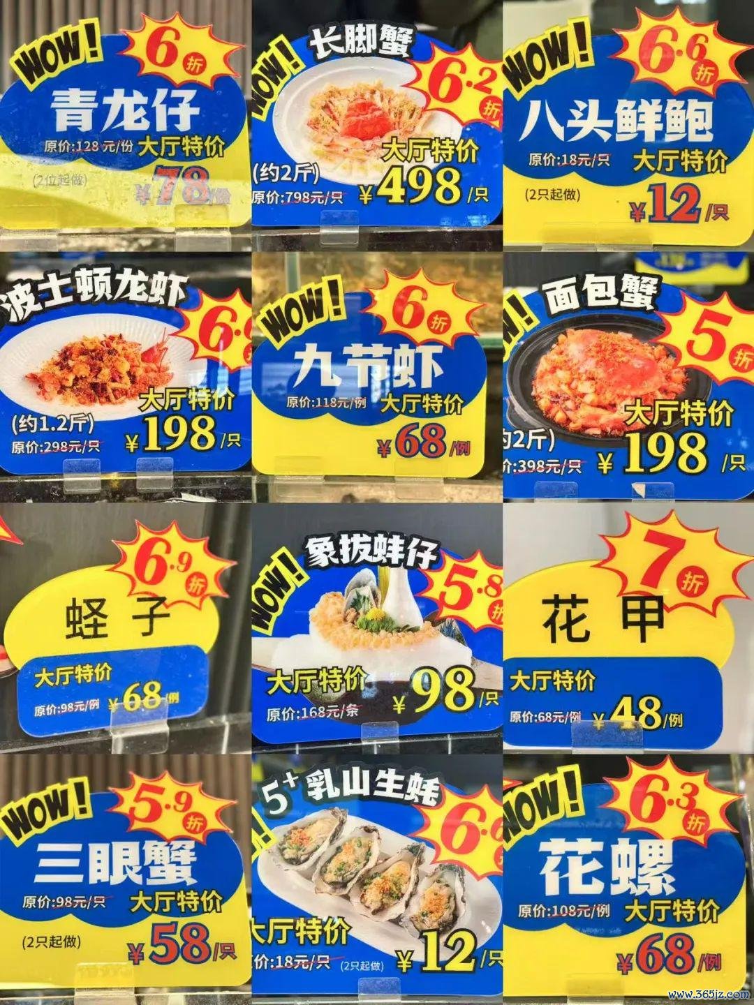 海鲜池逐日都有5折起,牌上就有一口价,清清白白不会被坑,小海鲜大海鲜都有。