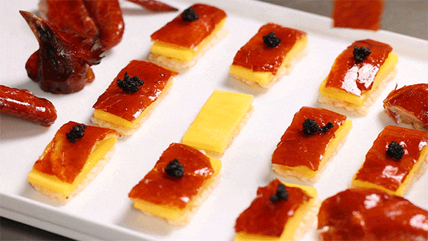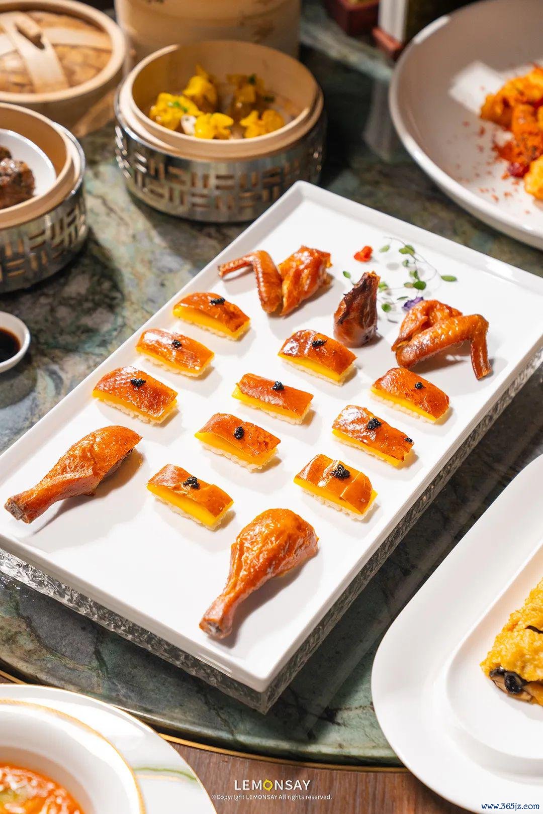 这谈大菜眩惑了好多门客,真实桌桌都有。罗致180天走地鸡,手工现烧出炉,片出最精华的脆皮,搭配催米片、鲜芒果层叠,终末加上黑松露点缀,口感和仪态都更上一个档次,一口一知足!