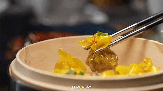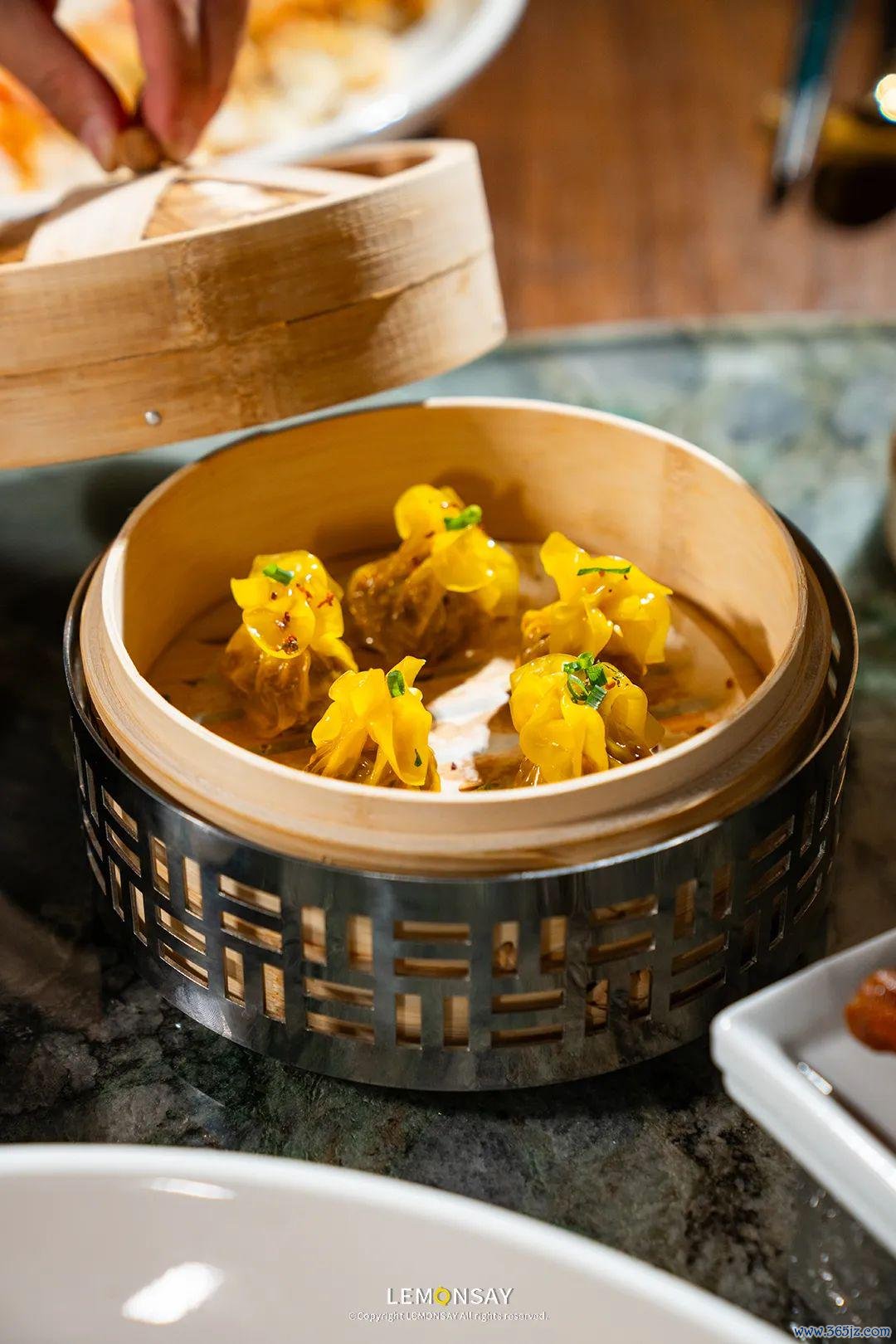 菊花烧卖 经师父手锤肉粒,手工抓制成菊花盏状,传统之外又作念了翻新,现点现蒸。馅料用的是三肥七瘦精肉,加入黑蒜增添浓香仪态,啖啖肉啖啖香!