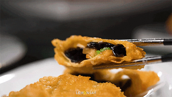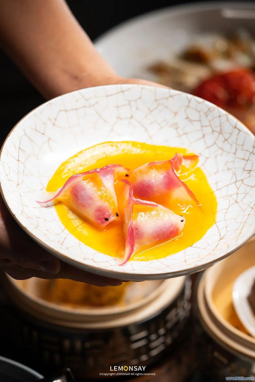 这份点心手作师父必须有5年案板纯属才调作念出那么纯真,馅料用了带子、海胆、虾仁,馅皮用火龙果、胡萝卜汁点缀入色,纯手工制作鱼鳞,抓成金鱼体式,一份3只竟然可儿极。皮薄馅满,一口咬下鲜味皆备。