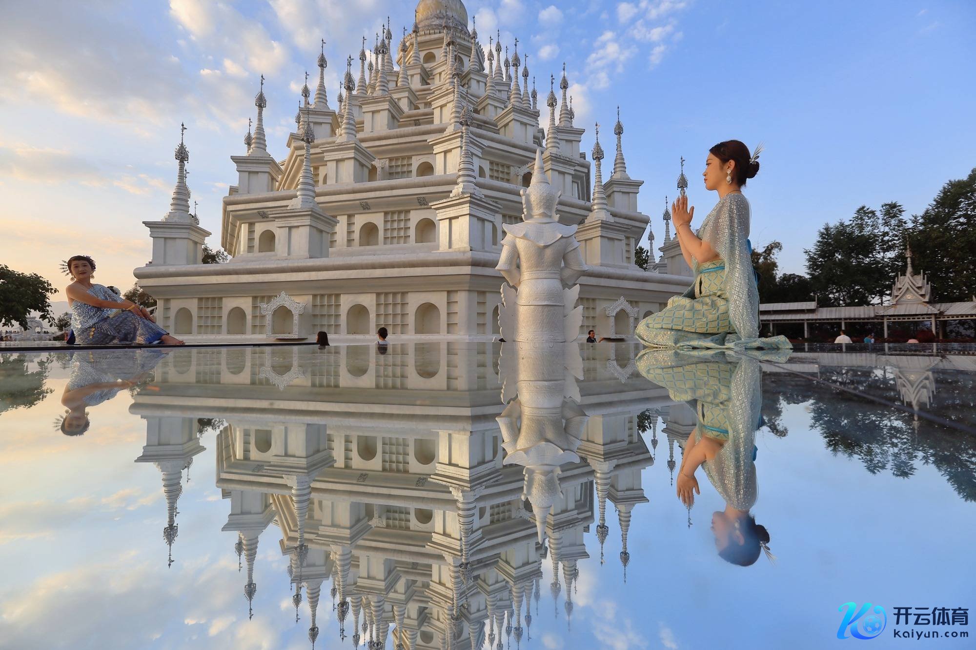 同银塔合影最佳的角度便是太空之镜打卡点。闲散的水面反照着巍峨伫立的银塔和蓝天白云,搭配风情万种的傣族衣饰,氛围感一刹拉满。