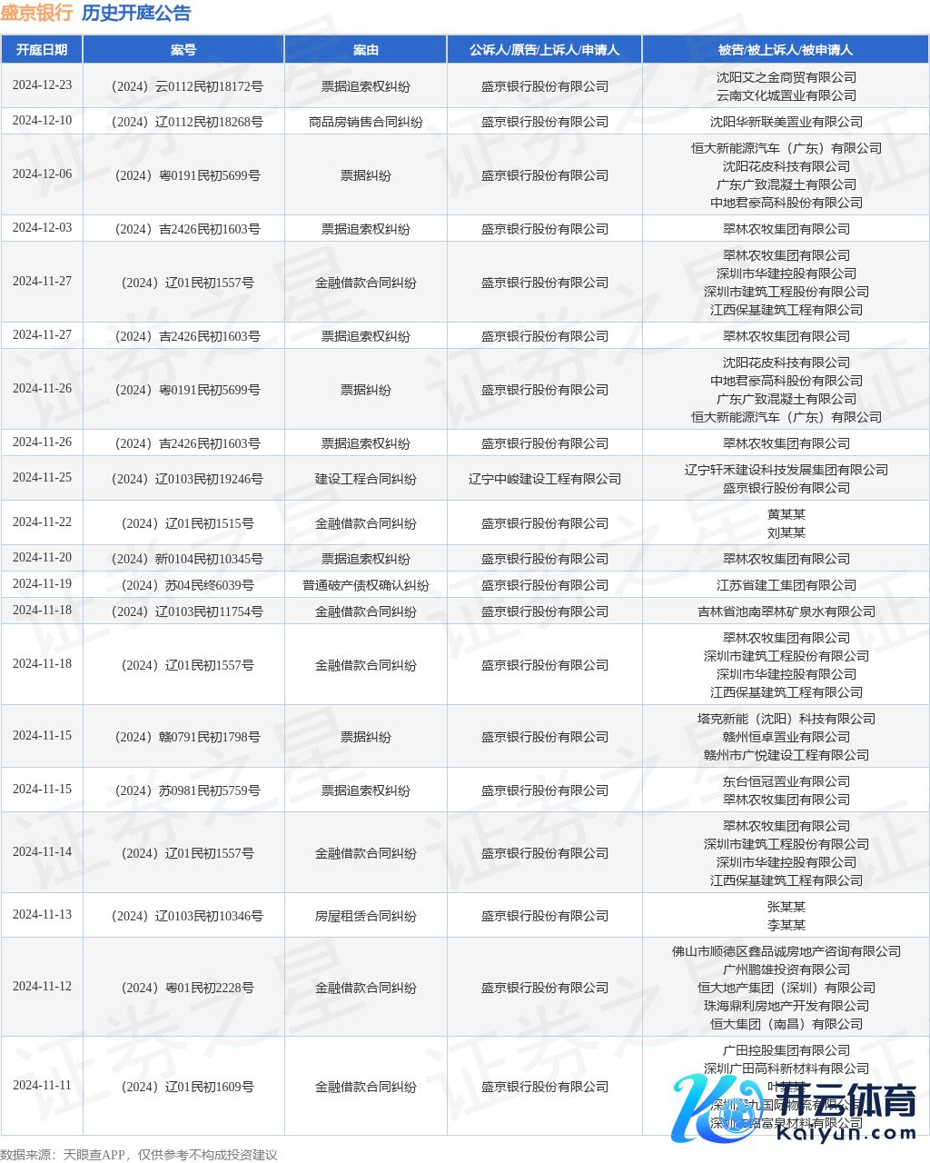 案号:(2024)吉2426民初1603号审理法院:安图县东说念主民法院案由:单据追索权纠纷当事东说念主信息: 原告/上诉东说念主:盛京银行股份有限公司 被告/被上诉东说念主:翠林农牧集团有限公司开庭日历:2024年11月26日字据统计,近一年内以盛京银行股份有限公司为当事东说念主的历史开庭公告有400则,其中案由为“单据追索权纠纷”的公告以150则居首,其次为“单据纠纷”有96则,“金融借款公约纠纷”有93则。历史开庭公告(前20条)如下: