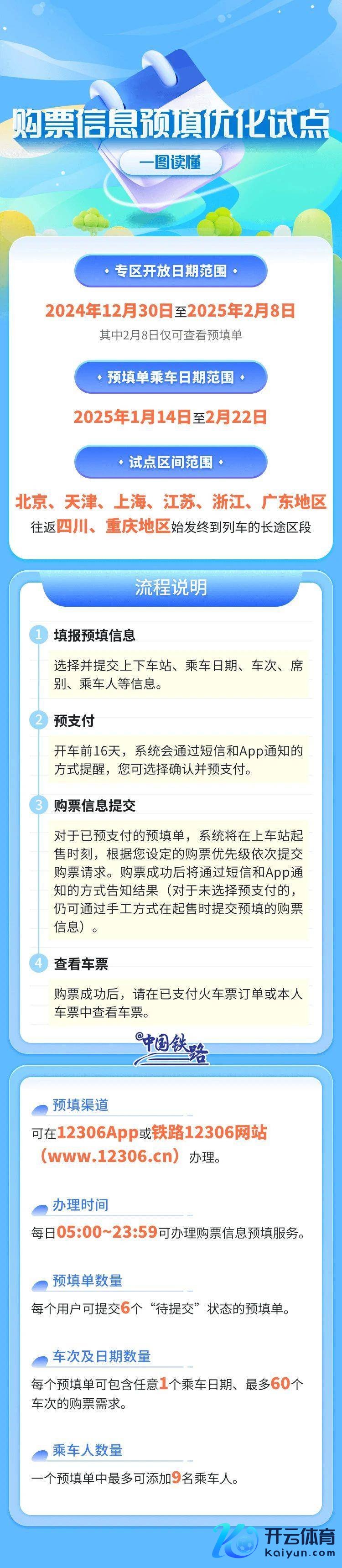 ⭐️2024年12月30日至2025年2月8白昼,在北京市、天津市、上海市、江苏省、浙江省、广东省各车站往返四川省、重庆市各车站始发终到列车的资料区段车票发售中,在购票信息预填的基础上,试点推出“系统自动提交购票订单”功能。