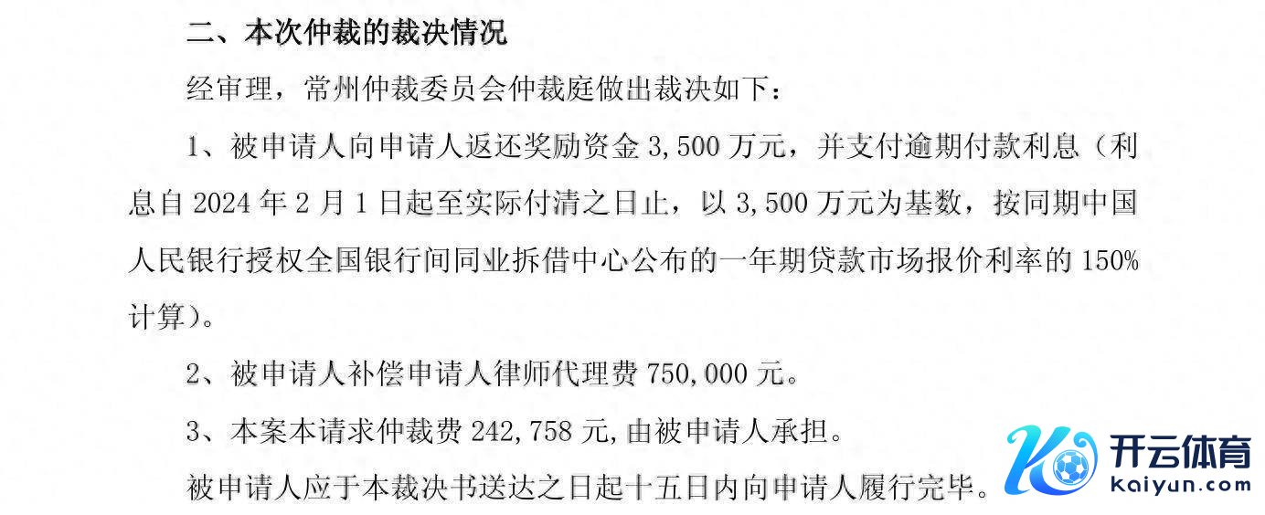 经审理,常州仲裁委员会仲裁庭作念出裁决,公司向常州高新区管委会返还奖励资金3500万元并抵偿常州高新区管委会讼师代理费75万元。