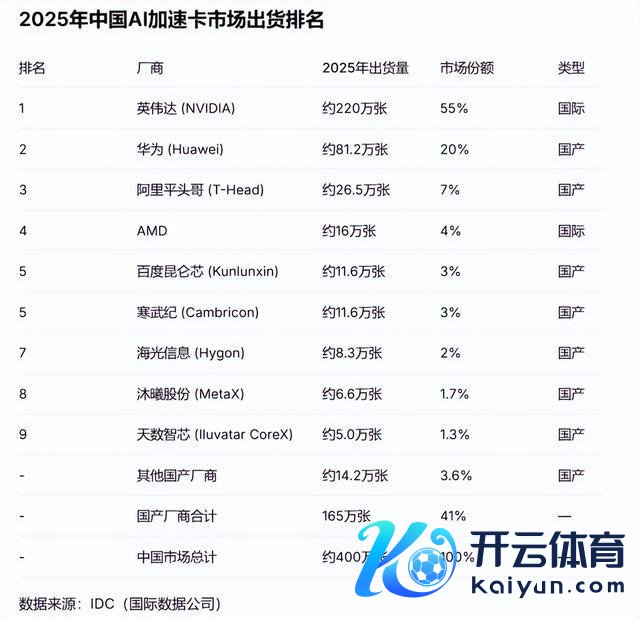 先是数据,这是IDC统计的2025年中国AI芯片阛阓销量,份额占比情况,不错看到英伟达仍是唯有55%傍边了,较前期最高95%的份额,下滑了40个百分点,差未几是腰斩了。